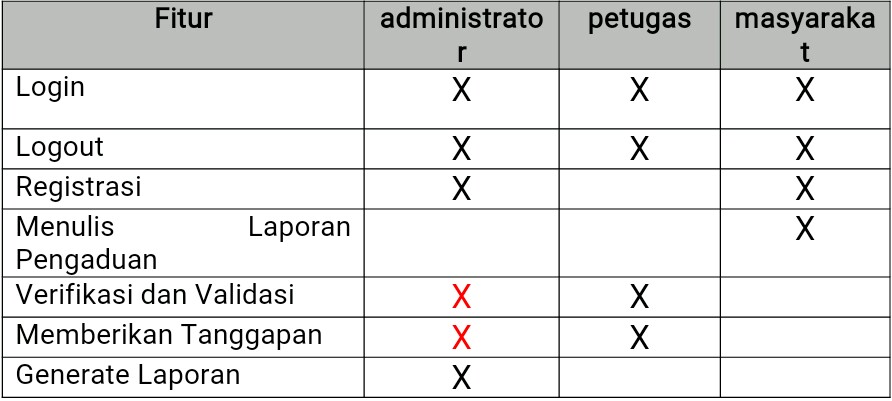 c.Aplikasi menggunakan pembagian privilege dengan tingkatan (administrator, petugas, masyarakat)